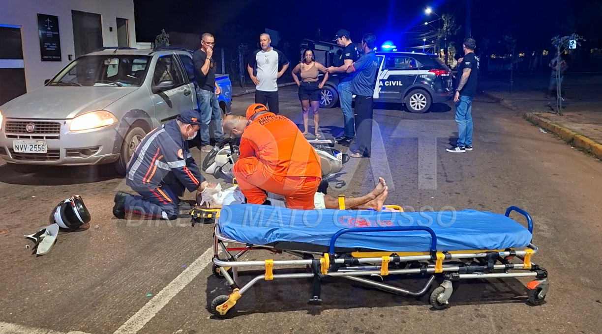 Um motociclista de 27 anos foi socorrido por profissionais do SAMU após colidir com a moto Honda Biz de cor branca que conduzia na traseira de uma Fiat Strada de cor prata, no cruzamento da Avenida Amazonas com a Rua XV de Novembro, em frente à 1ª Delegacia de Polícia Civil, na região central de Rondonópolis-MT.