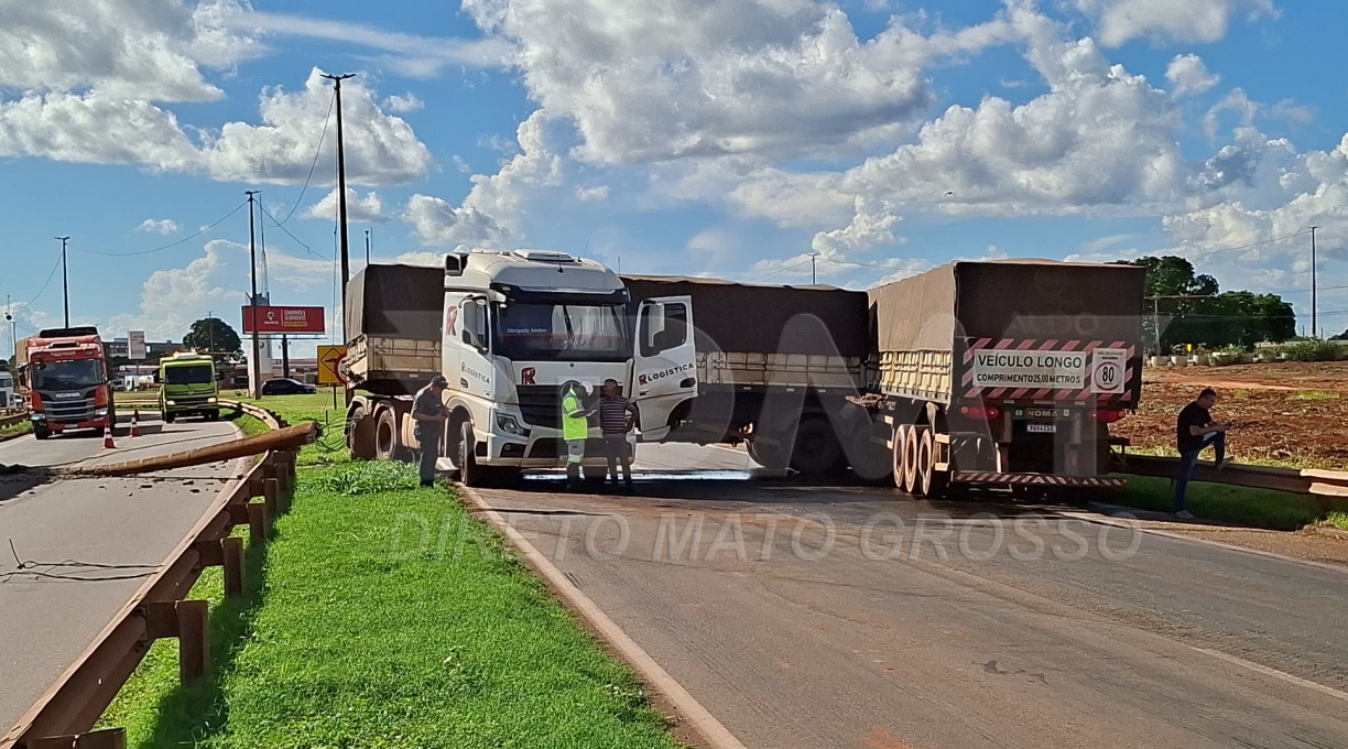 Um acidente envolvendo uma carreta bitrem graneleira, na tarde desta terça-feira (07), que ficou atravessada na pista, ocasionou grandes congestionamentos e transtornos para outros usuários. A situação ocorreu devido a uma saída de pista, seguida de colisão contra um poste de iluminação pública, na BR-364, km 205, no perímetro urbano de Rondonópolis-MT.
