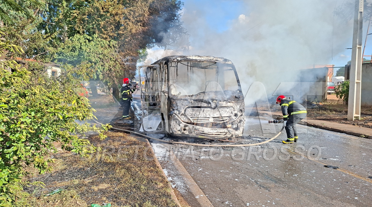 Um ônibus de uma empresa particular pegou fogo na tarde desta segunda-feira (13), na Rua Capitão Ademir de Jesus Ribeiro, marginal da BR-364, via de acesso à região do Parque Universitário, em Rondonópolis-MT.